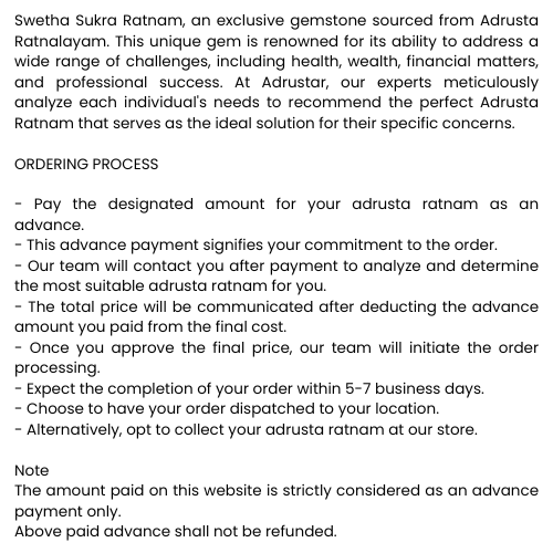 Swetha Sukra Ratnam, an exclusive gemstone sourced from Adrusta Ratnalayam. This unique gem is renowned for its ability to address a wide range of challenges, including health, wealth, financial matters, and professional success. At Adrustar Jewels, our experts meticulously analyze each individual's needs to recommend the perfect Adrusta Ratnam that serves as the ideal solution for their specific concerns.
